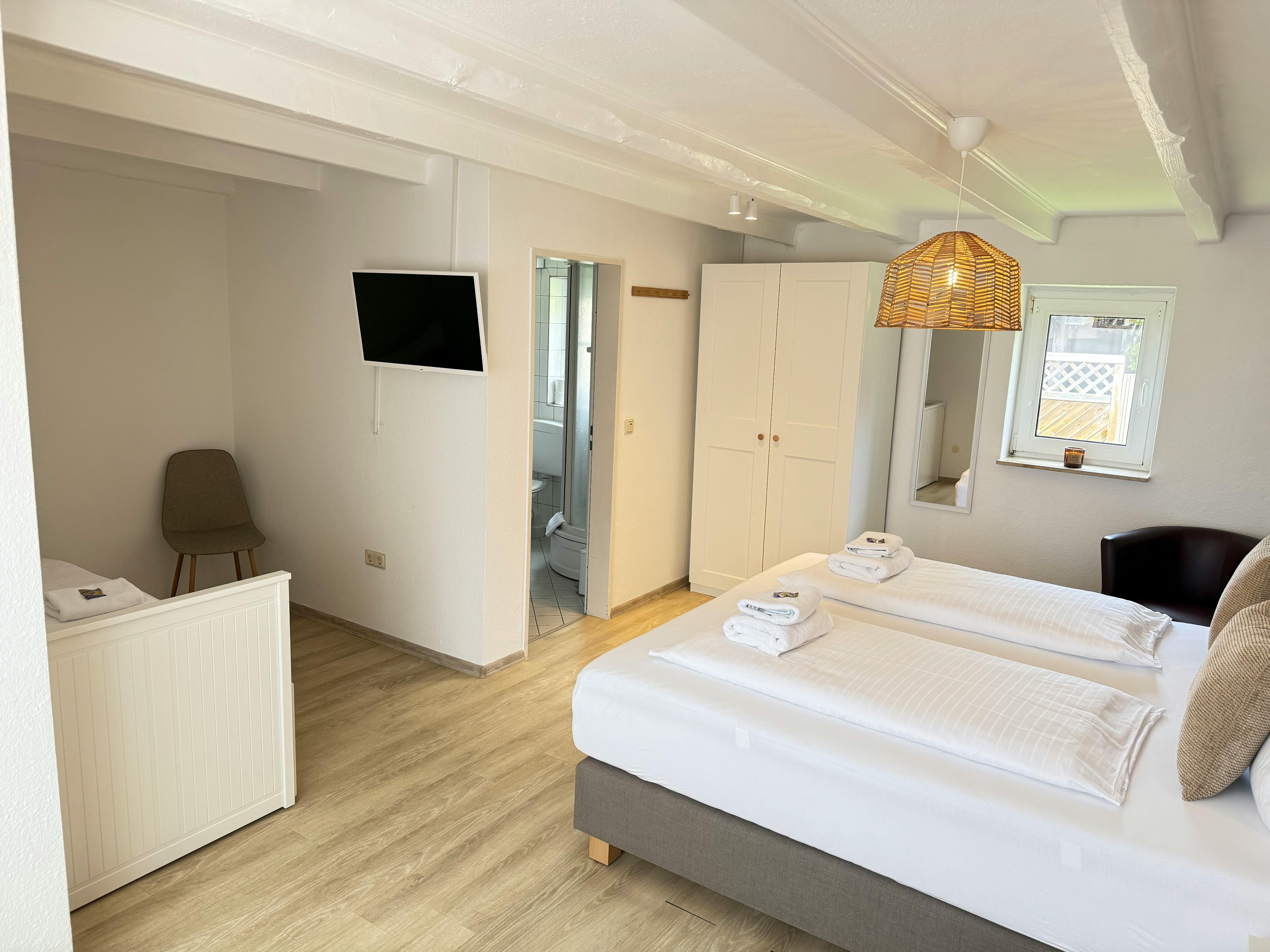 The triple room includes a wardrobe, an electric kettle, and a private bathroom with a shower and a hairdryer. This triple room features heating and a flat-screen TV. There are 2 beds in the unit.